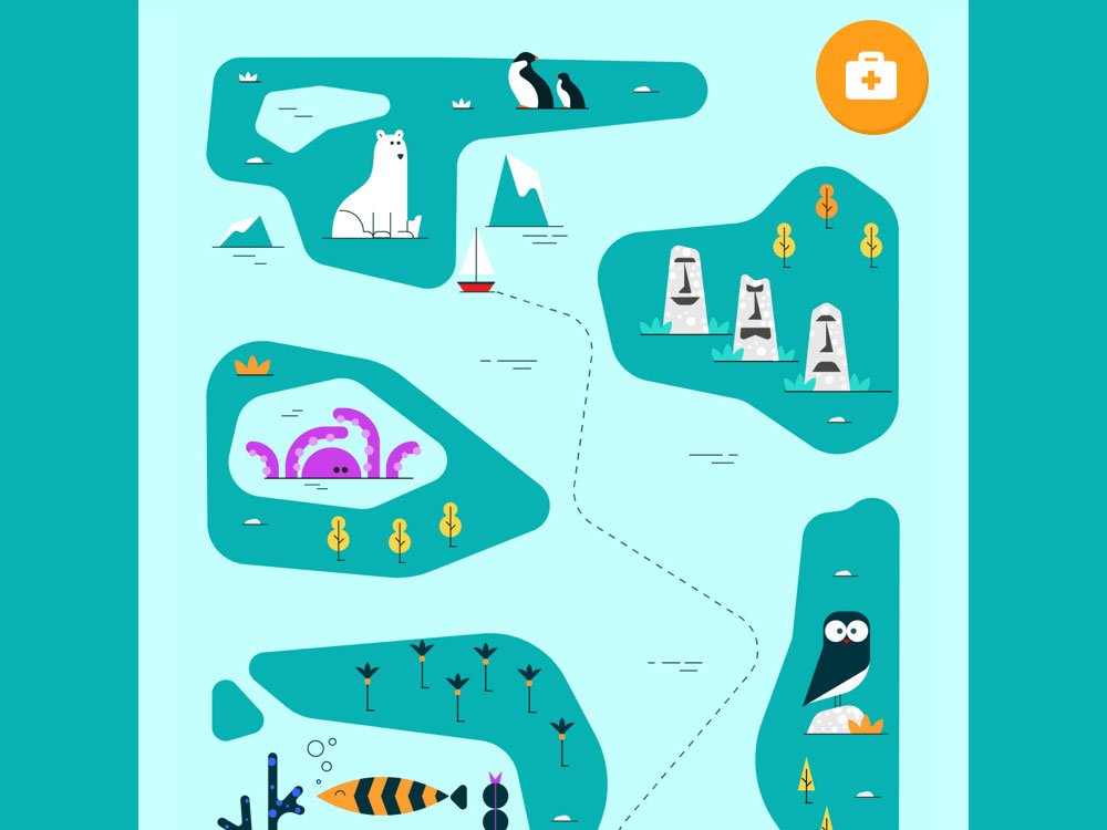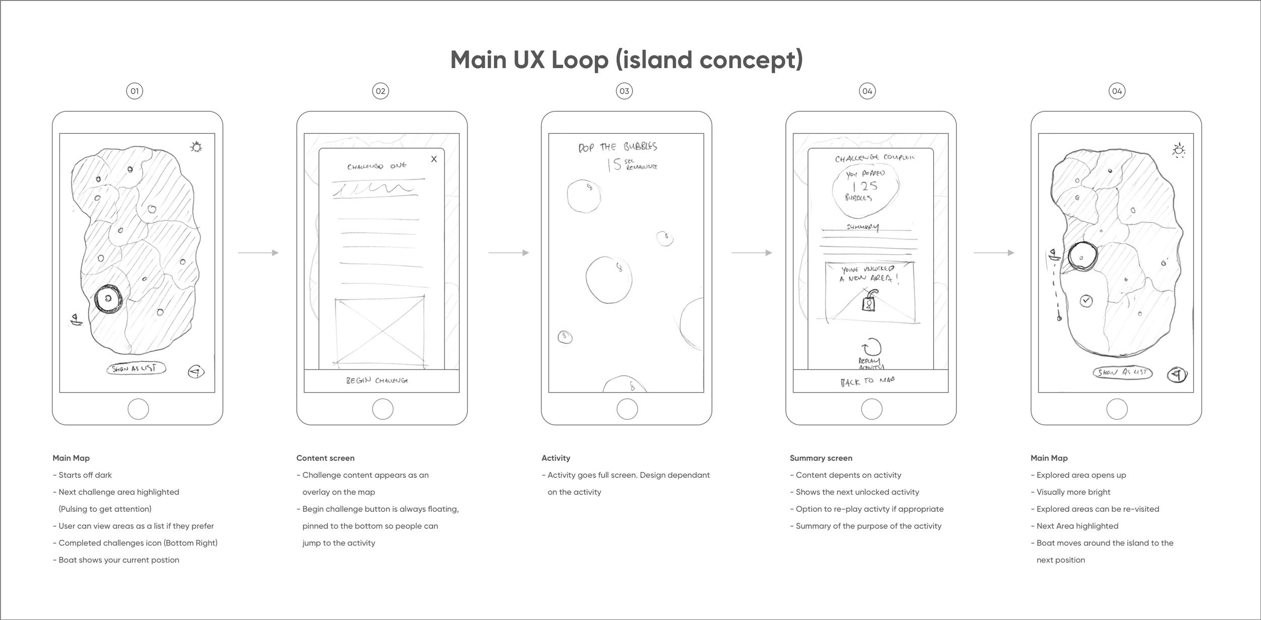 We developed a concept around exploring an island and changing the state of it from dark and unknown to full of life and activity as a means of delivering content and exploration. This aimed to encourage people to visit all of the content on the app.
