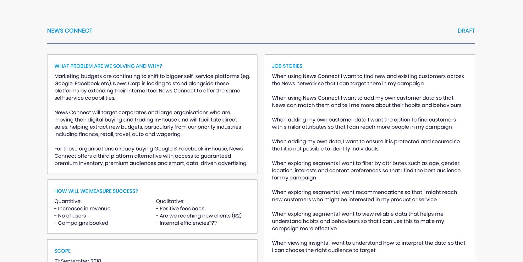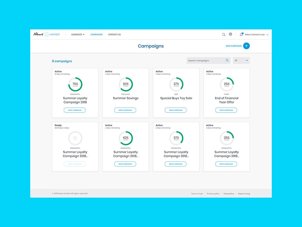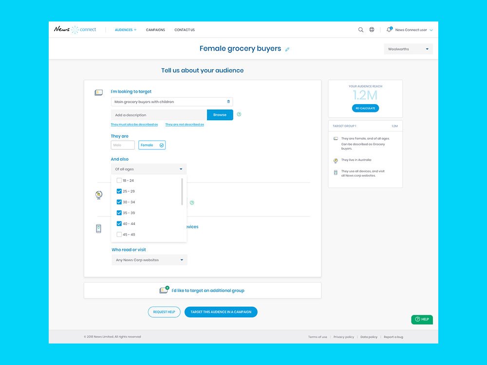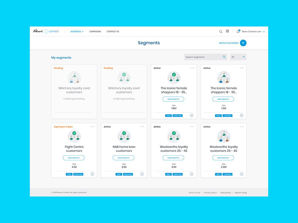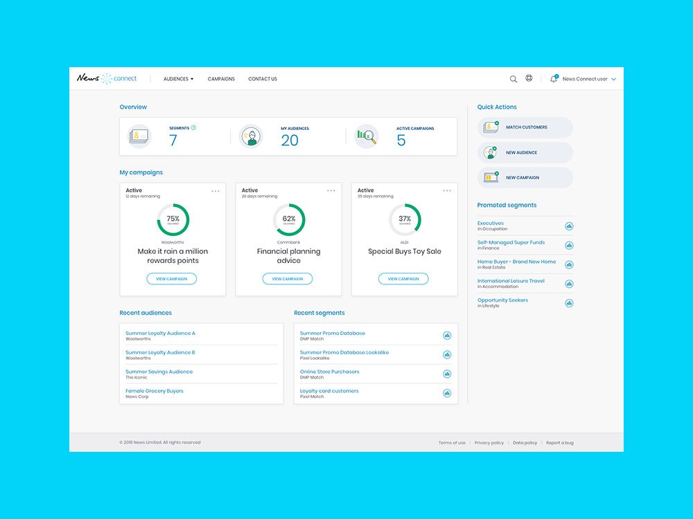 News Connect is an internal tool used by the ad sales teams at News Corp to help their customers find and target the right audiences in their ad campaigns. I was contracted to work as the Lead UX designer in their core product team, to assist in launching News Connect as a customer facing platform.